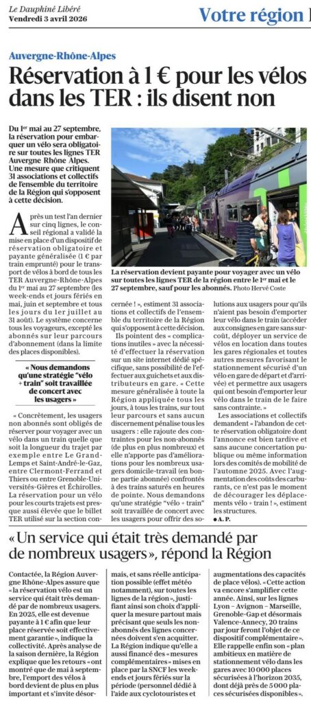 Le Conseil Régional vient de valider la réservation obligatoire et payante généralisée (1 € par train emprunté) pour le transport de vélos à bord de tous les TER Auvergne-Rhône-Alpes, du 01/05 au 27/09/2026, pour tous les voyageurs, excepté pour les abonnés sur leur parcours d’abonnement (dans la limite des places disponibles).