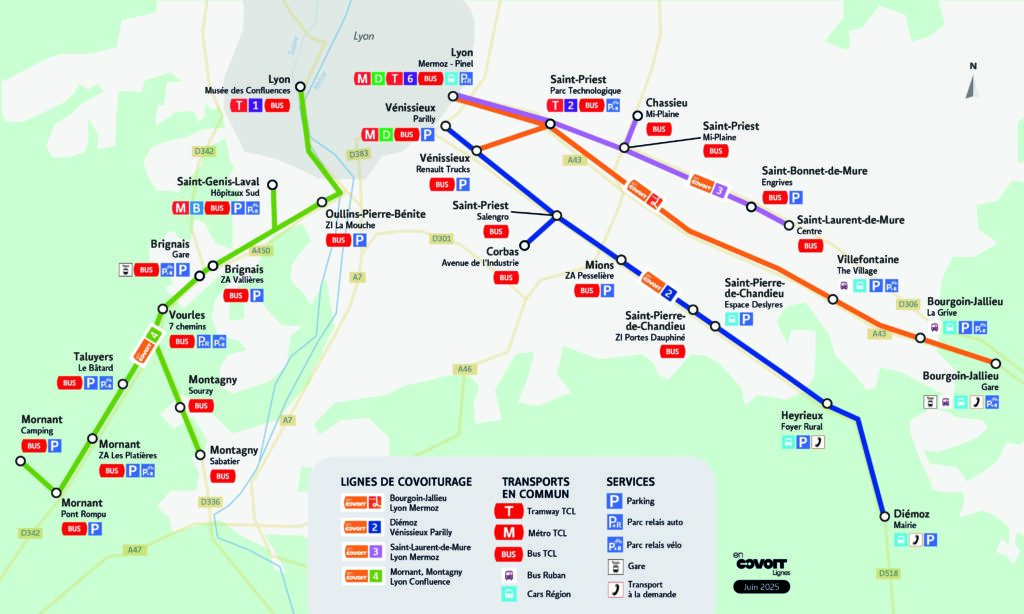 => Celui-ci va d’abord proposer 4 lignes de covoiturage dans l’aire métropolitaine lyonnaise dont 3 à l’Est de Lyon avec :