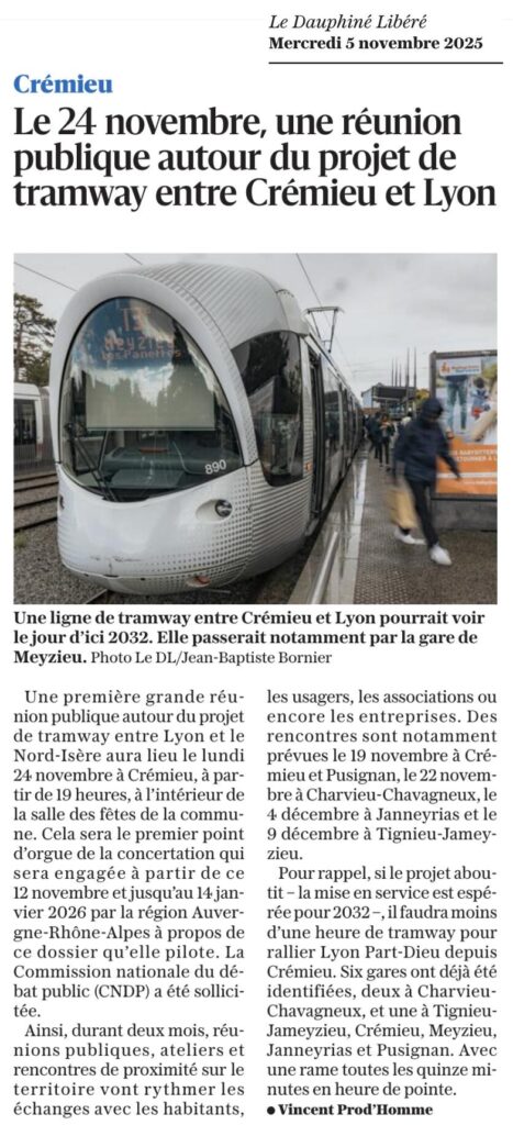 • Un webinaire d’information le 12/11 à destination des associations et acteurs économiques + une réunion publique le 24 novembre, de 19h à 21h , salle des Fêtes de Crémieu. Le bilan de la concertation sera restitué au plus tard le 14 mars 2026, à la veille des municipales…